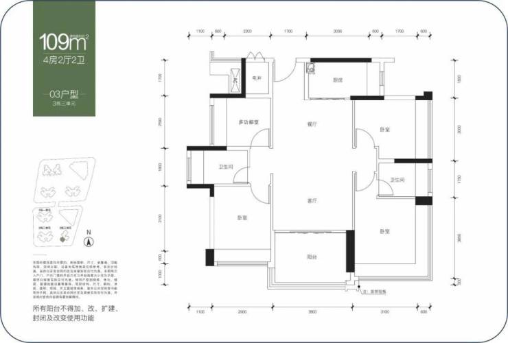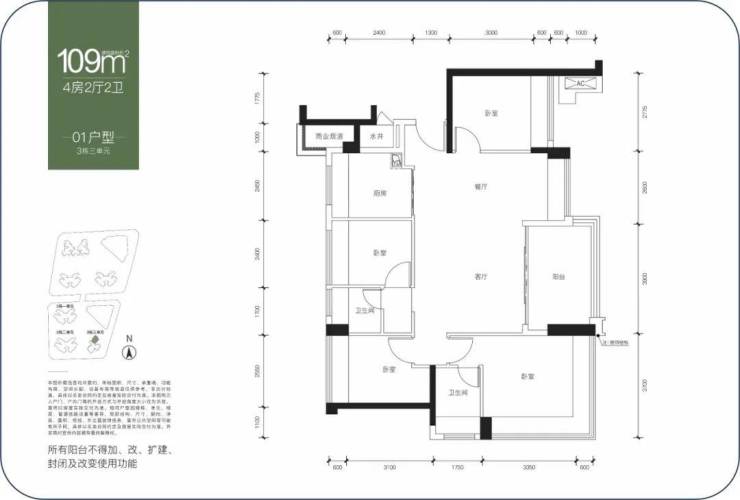 建面约109㎡,四房两卫,分布在3栋3单元,01户型是传统横厅结构,突出亮点是客厅大面宽采光,餐客厅一体化,隐性过道与餐客厅完美融合,显得客厅比较宽敞,整体结构三面采光,通风采光性能俱佳;缺陷也比较明显,那就是居家静溢性欠缺。