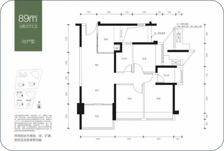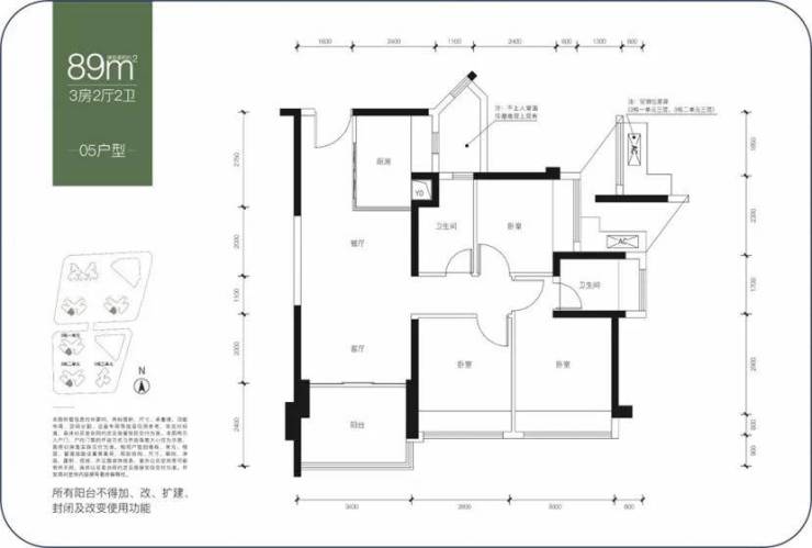建面约89-90㎡,三房两卫,两者户型结构基本一致,都是动静分区结构,相比之下,89㎡户型动区面积小一点,90㎡是静区面积小一点,总的得房率差距很小,整体尺度比较舒适,经典实用型产品。