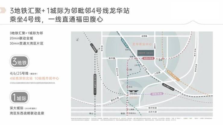 项目1.5公里范围内分布有布龙路、和平路、龙观大道、福龙路等主干道,加上龙华本身地处深圳中轴,理论上对外自驾通勤是比较方便的