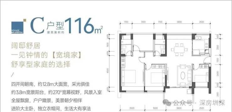 116㎡的4房2厅2卫,C户型,设计的是竖厅南北通透格局,餐客厅一体化设计,客厅3.8米开间,四开间朝南,4个卧室分别做到了主卧17.85㎡/次卧11.4㎡/次卧9.3㎡/次卧8㎡(包含墙体飘窗),都不用搭配飘窗做床,U型厨房,卫生间干湿分离,得房率约:93.13%(包含赠送),阳台主朝西南、东南或正南向。