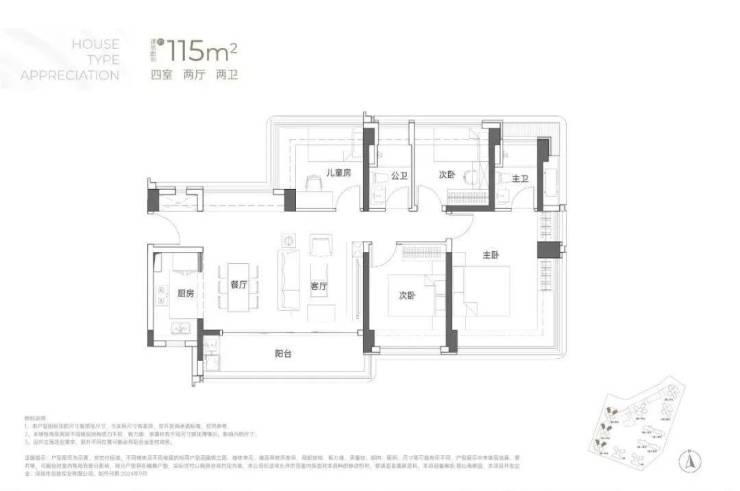 115㎡的4房2厅2卫:横厅南北通透格局,客餐厅6米开间,LDKB一体化,全屋飘窗,4个卧室分别做到了3.9米/3米/2.8米/2.6米的宽度,主卧加1个次卧270°全景飘窗,客厅出6米长的大阳台,L型厨房,得房率约95-97%(包含赠送),西南或东南朝向。115平米户型分布在1栋1单元、1栋2单元、1栋3单元01/02户型,01户型西南朝向都是看小区外围,02户型看向小区;