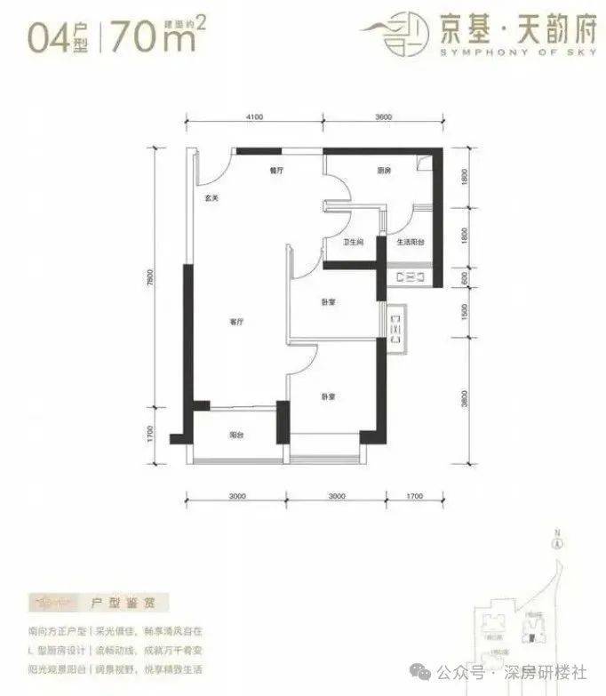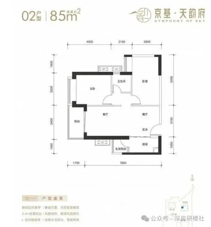 竖厅格局,客厅3.15米开间,两个卧室宽度分别为3.2米和2.8米,L型厨房带生活阳台,得房率81.47%(包含赠送),阳台3.4米长,进深1.7米,主卧阳台朝东向,高层可欣赏深圳水库景观。
