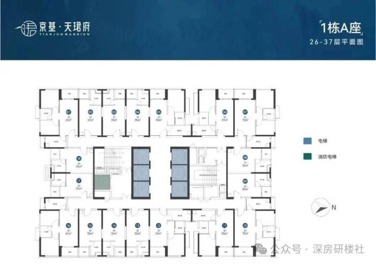 京基天韵府总占地面积约1.95万㎡,总建筑面积约24.6万㎡,计容建筑面积约20万㎡。项目由3栋62层的超高层住宅和1栋52层的商办公寓组成,容积率10.26,绿化率36%。住宅部分建筑面积为116740㎡,折合90㎡/套计算,约有1297套房源,其中商品房244套,采用5梯7户设计,地下4层,停车位995个。此外,项目还自带1所9班制幼儿园,为业主子女提供便利的学前教育。
