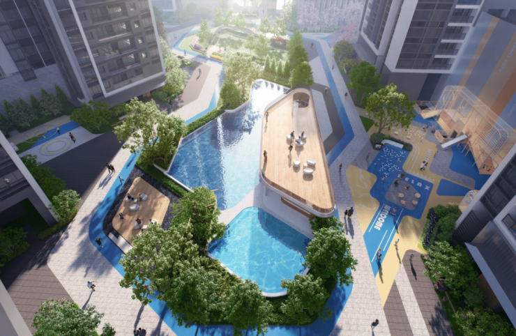 多元交互园林:空中运动花园、全龄亲子双游泳池、环氧跑道、稚趣IP乐园、城市会客厅等,亲子、社交、远动一应俱全;