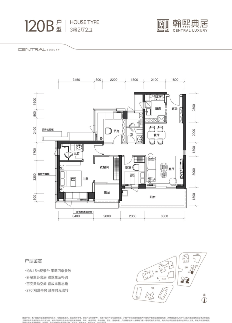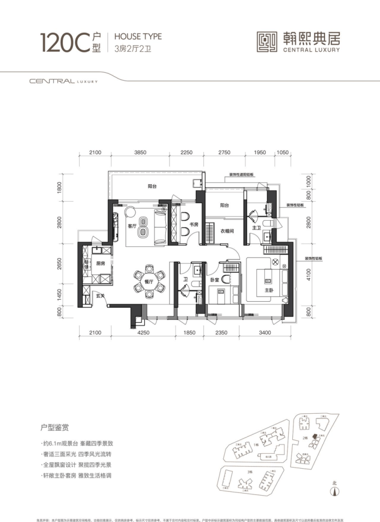 该户型为 02 地块的唯一一条腿,非常稀缺。户型南北通透,带大主卧套房的奢居型三房。带 5.4m 观景台,大横厅奢阔空间设计,主卧同客厅阳台、餐厅三面宽朝西南。北向双次卧、双卫生间、拓展空间共五面宽一字排开,视野全面俯瞰社区内园林,静谧舒适。