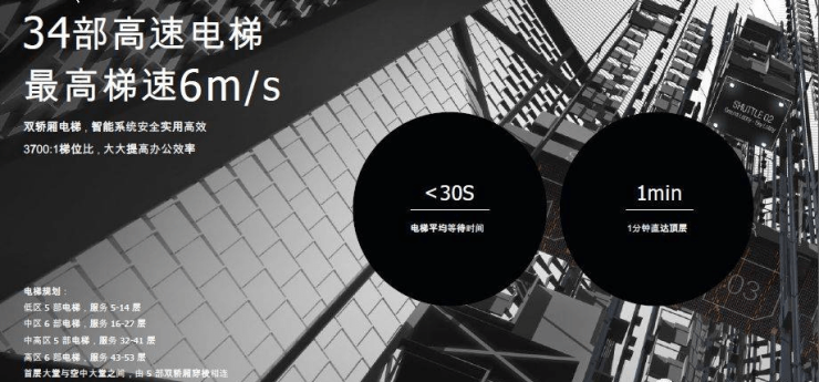 若除却避难层,实际上每层电梯配比也就更高。此外在空中大堂处也有5部双轿箱穿梭电梯与首层的双层大堂相连,更便捷于不同高低区办公人士的需求,企业效率更加高效。
