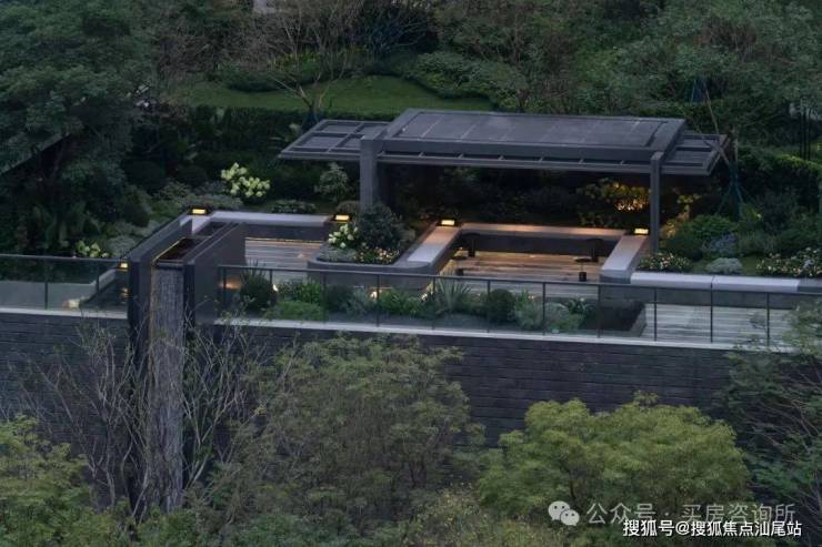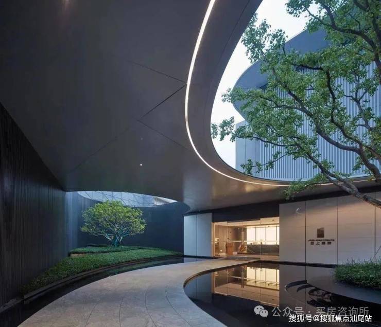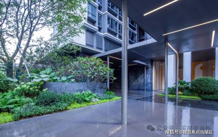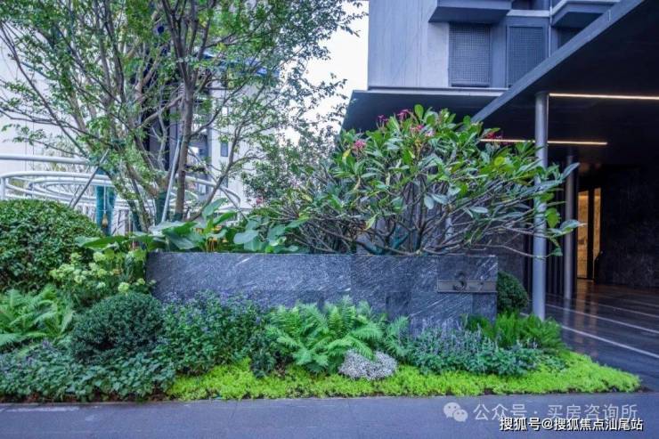 每栋楼入户大堂前设置一处特色景墙,材料使用少见的黑色乱纹浪淘沙石材,尽显入口处低调的奢华。同时结合景墙精选冬青或朴树,独特有致的造型,骨于有力的枝条,赏心悦目,再结合种植花境打造专属入户园林空间,形成入户有花有景的精致景观。