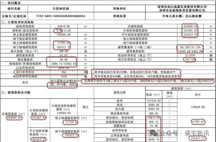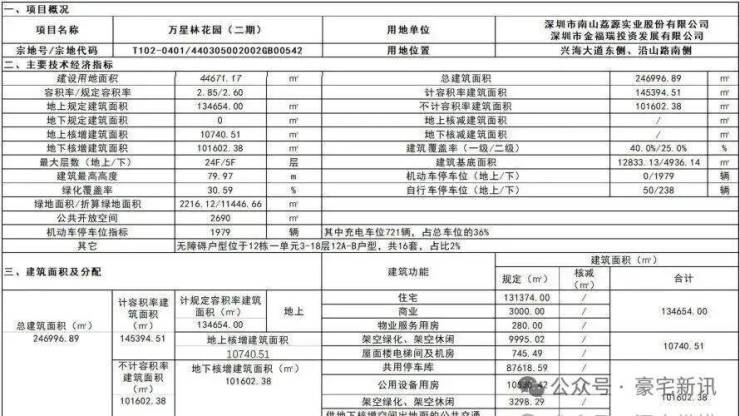 万星林花园项目位于前海合作区南山街道兴海大道东侧,沿山路南侧,宗地号T102-0401。根据本项目《深圳市国有建设用地使用权出让合同》及《建设用地规划许可证》,项目总用地面积53819.80平方米,用地性质为二类居住用地;计规定总建筑面积139654平方米,其中住宅131374平方米、商业3000平方米、幼儿园5000平方米(独立占地面积5400平方米,18班)、物业管理用房280平方米;规定容积率≤2.6;建筑一级覆盖率≤40%,二级覆盖率≤25%;建筑高度限高80米;机动车泊位数1979辆;地块内需提供不少于2690平方米公共开放空间。