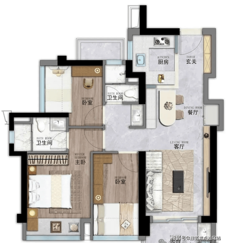 86㎡的3房2厅2卫,设计的是竖厅格局,进门入户玄关,客厅3.2米开间,LDKB一体化,S墙设计预留冰箱位,三开间朝南,3个卧室分别做到了3米/2.4米/2.4米的宽度,U型厨房,公卫三段式分离,还带1个设备平台可以使用,得房率约:89%(包含赠送),阳台有东南或西南朝向。