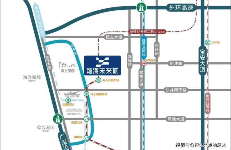 交通配套:卓越前海未来城,家门口就是12号地铁线“海上田园东站”,一期是最靠近地铁站的,2站到国展北站可以换乘20号线,6站到福永站还可以换乘11号线,快速通达宝中,南山区。