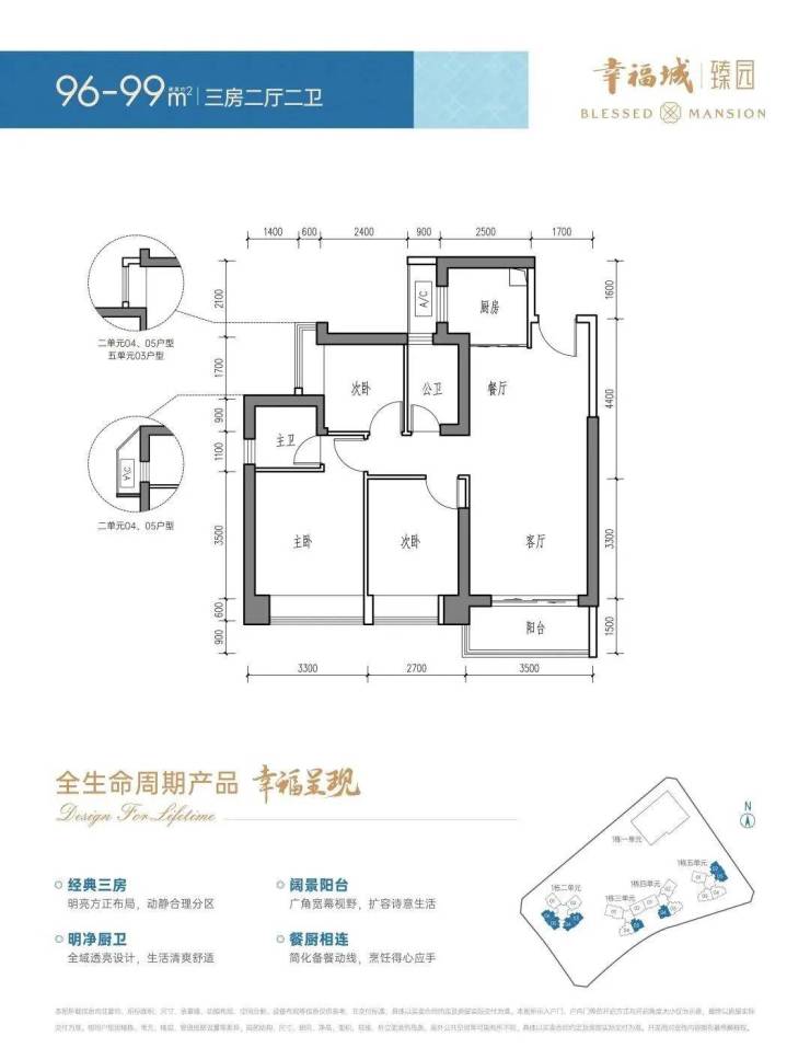 96-99㎡的3房2厅2卫,设计的是经典竖厅格局,客厅3.5米开间,LDKB一体化设计,动静分区,3个卧室分别做到了主卧14.63㎡/次卧11.07㎡/次卧7.26㎡(包含墙体飘窗),U型厨房,卫生间干湿分离,得房率约81-84%(包含赠送),东南/西南或东北朝向。