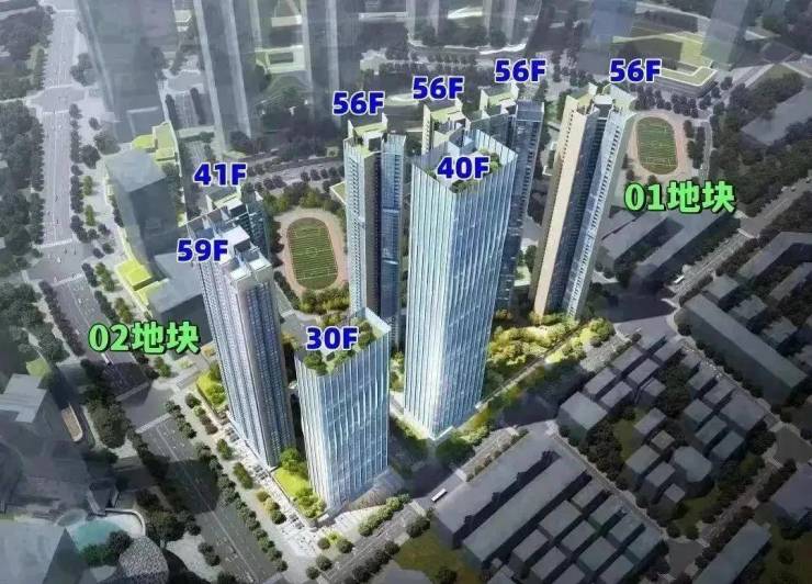 另一个01-02地块,总占地约1.23万㎡,总建筑面积约15.08万㎡,计容建筑面积约10.85万㎡,容积率为8.31,绿化率同样为40.01%,该地块由2栋41至59层高的住宅楼组成,其中3栋为41层的住宅楼,4栋为59层的公共租赁住房。此外,还有5栋是30层的办公楼,以及2栋是一所9班制幼儿园。