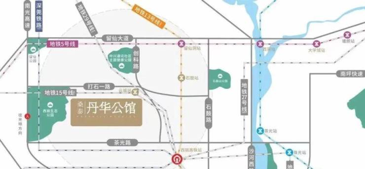 项目周边有5号线的留仙洞站(距离较远,步行距离1.8公里)、13号线(建设中,预计2023年年底开通)石鼓站(距离约900米,步行10分钟左右)和最近的地铁站15号线(建设中)打石一路站,直线距离约400米左右。