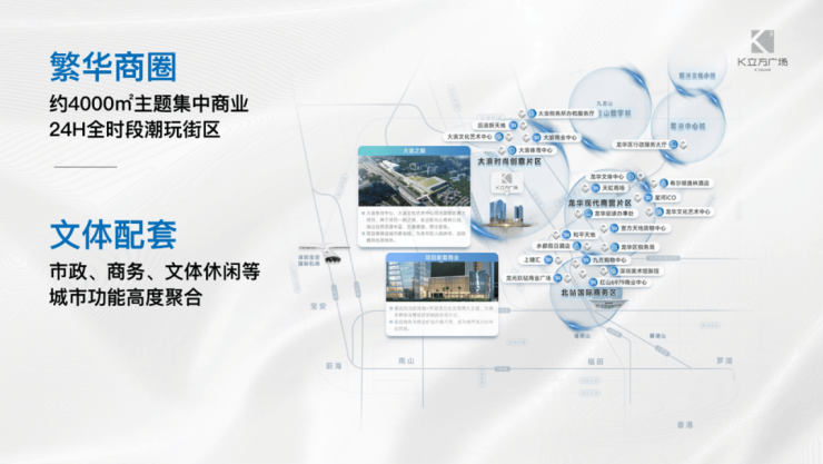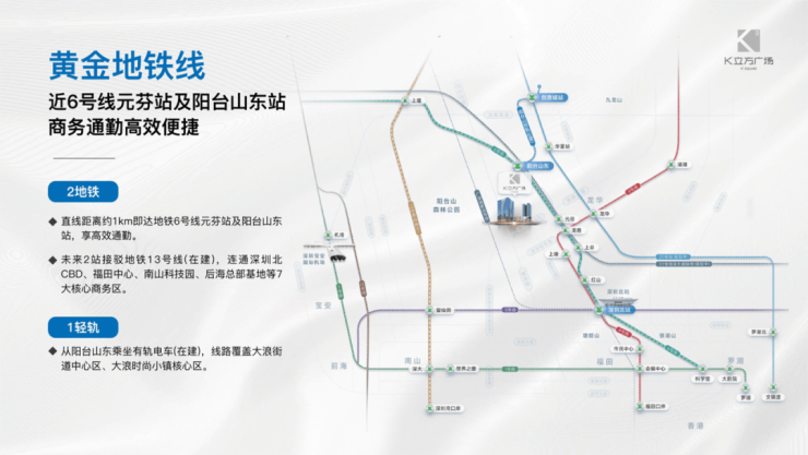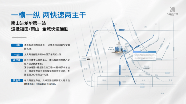 K立方广场,项目位于深圳中轴商务中心,占据龙华商务中心与数字经济圈的黄金交汇点。交通便捷,直线距离约900m即达地铁6号线阳台山东站、元芬站,3站可达深圳北站;福龙快速联通香港直达福田、南山科技园等核心商务区,沈海高速可快速到达深圳宝安国际机场、松山湖。