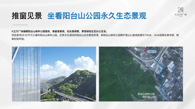 紧邻约28.52平方公里的阳台山森林公园,近享永无遮挡的阳台山生态景观资源,距阳台山森林公园绿道入口直线距离仅约700米,门口配套4A级景区。推窗是景观,处处是绿意,自由呼吸鲜氧,享受绿色生态办公生活!