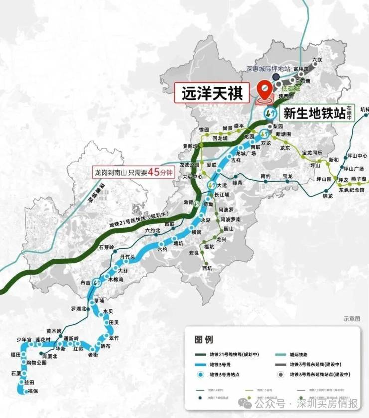 远洋天祺距离地铁3号线东延线和21号快线双轨交汇“新生站”直线距离仅约500米,是片区离地铁最近的在售项目,未来还有深惠城际前海保税区至坪地段,全长58公里,时速160公里/小时,以后从项目到南山、前海也很方便快捷。