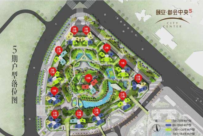 目前有少量产品在售的颐安都会中央五期,是整个项目规划及建设规模最大的一期,总建筑面积约23.9万㎡,一共设计6栋13座住宅,共1643户;配有车位1730,车位比约为1:1.05,车位非常充足。