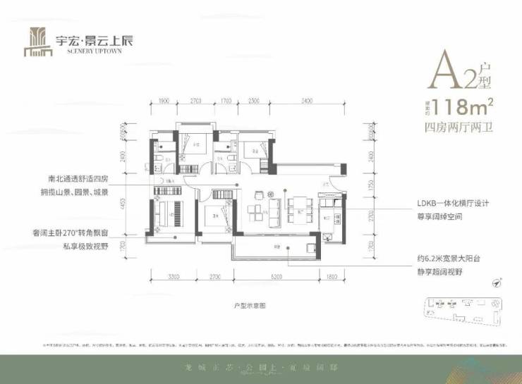 118㎡的4房2厅2卫,设计的是横厅南北通透格局,客餐厅6.2米开间,LDKB一体化,五开间朝南,西北面5.4米长的观景大飘窗,4个卧室分别做到了3.3米/2.7米/2.7米/2.3米的宽度,客厅连接餐厅位出6.2米长的大阳台,L型厨房,卫生间干湿分离,得房率约76%(不含赠送),东南朝向。