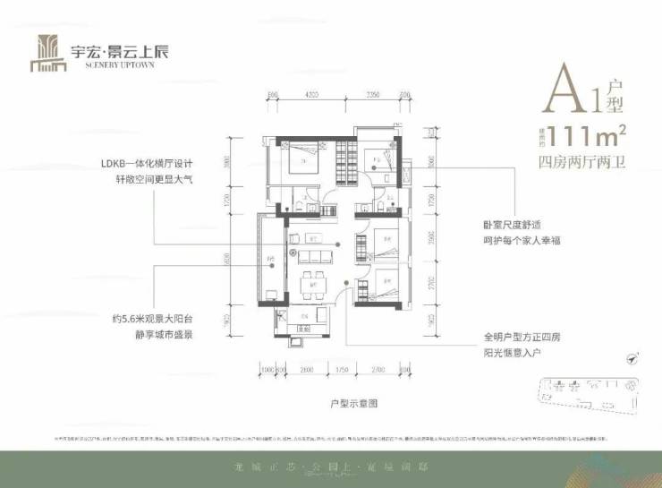 111㎡的4房2厅2卫,设计的是横厅南北通透格局,客餐厅5.6米开间,LDKB一体化,五开间朝南,4个卧室分别做到了3米/3米/2.9米/2.7米的宽度,客厅连接餐厅位出5.6米长的大阳台,L型厨房,公卫生三段式分离,得房率约76%(不含赠送),阳台主朝西南向