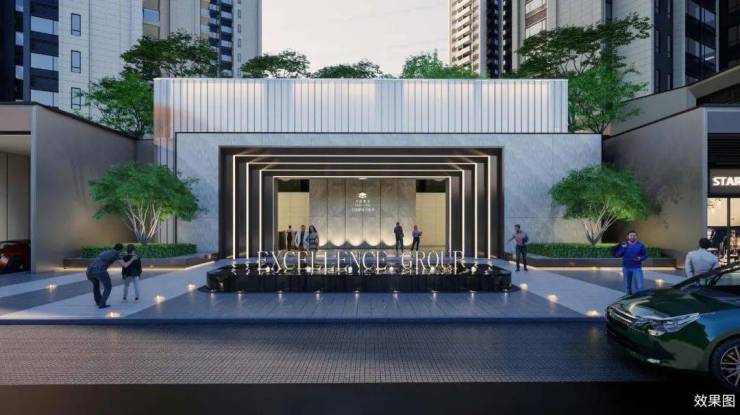 轻奢落客式大门:宽约23米气派门楼,艺术水景与铁冬青乔木