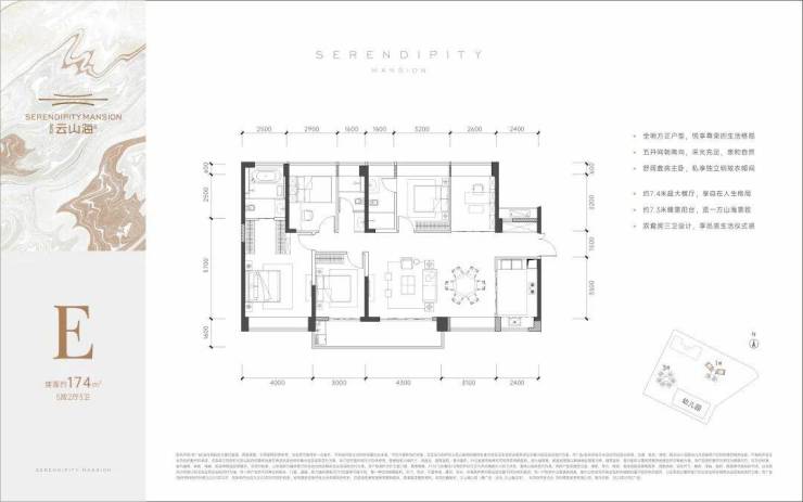 174㎡五房三卫双套间——7.3米大阳台、7.4米超大客餐一体化横厅、主卧4米超大开间,酒店式主卧套房带独立卫浴衣帽间,主开间全向朝南,双套房三卫设计,保证家人的私密起居