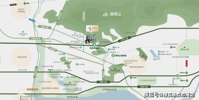 方直珑樾山位于南山桃源村片区,北环大道以北,塘朗山脚下,七号线深云地铁口。
