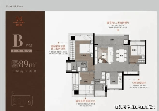 89㎡三房二卫A/B户型,位于1栋一单元,两开间阳台,主卧都有双面凸窗赠送。