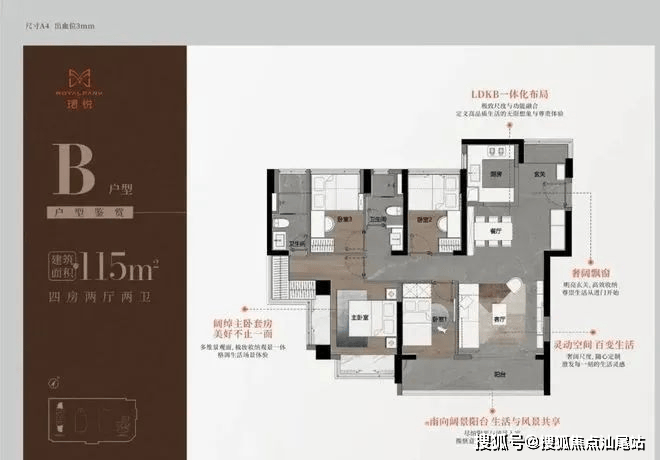 115㎡四房二卫A/B户型,大阳台,主卧通过凸窗赠送衣柜,但次卧尺度都偏小。