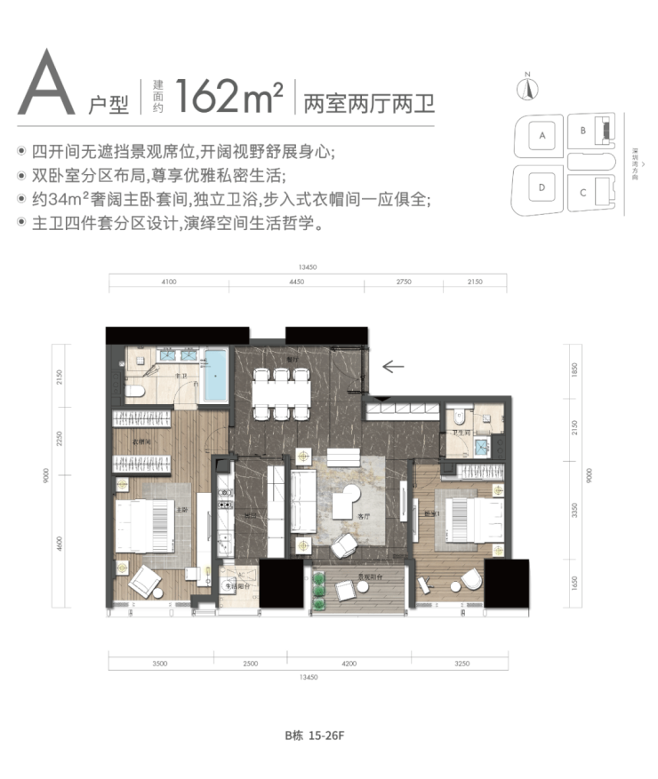 产品分段分布,162-164㎡户型分布在15-26层,223㎡以上户型分布在28-52层。