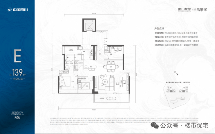 139㎡的4房2厅2卫,1栋03/2栋02高区户型,电梯入户送独立公区,设计的是竖厅类双龙抱珠格局,四开间朝南,主卧大套间设计,有1个多功能间可以做书房,6.4米长观景大阳台,L型厨房带1个生活阳台,卫生间干湿分离,得房率:72.07%(不含赠送),西南朝向。