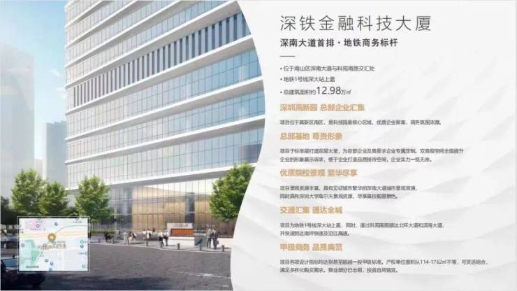 深圳南山深铁金融科技大厦开发商售楼处电话:400-088-3336,深铁金融科技大厦深南大道首排,深大地铁1号线上盖物业,国企品质一手物业,现房出售7-30楼层面积1303-1836-8000平米;地址:南山科技一路与科苑南路交叉口