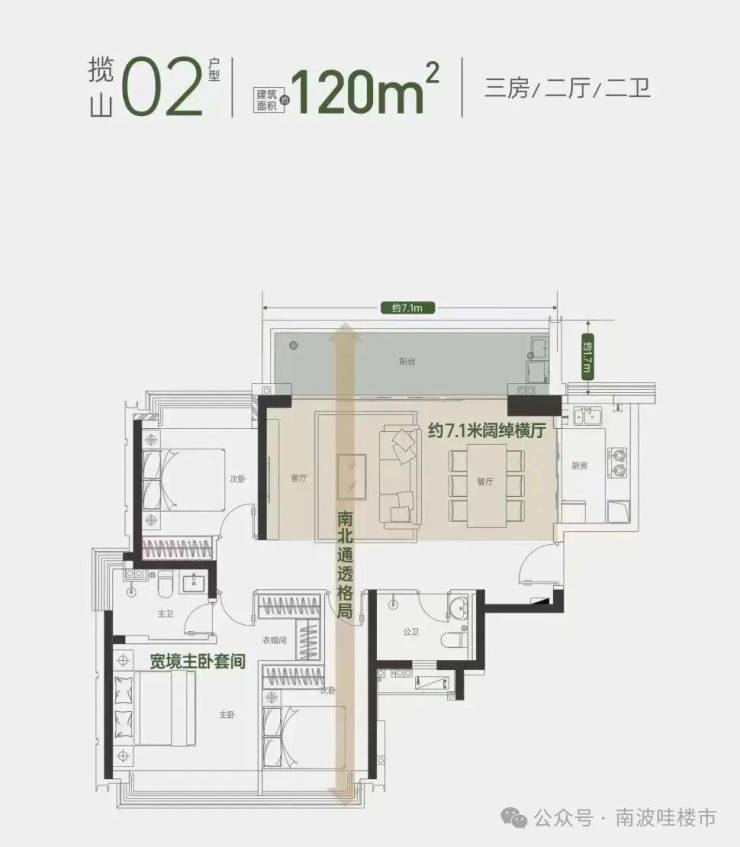 01/02户型 约120㎡3房2卫横厅:客厅阳台超7.1米,尺度很大,看向小区园林以及塘朗山山景,动静分离,户型方正视野开阔,属于居住体验非常阔绰的房型。约120平房源的北向视野,从2层开始就是满目的郁郁葱葱,20层以上俯瞰整个塘朗山,东南向视野更是集山景与繁华城市于一身。