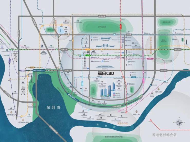 福田汇聚了行政、文化、金融、交通、会展、购物、酒店、公园与住宅九大核心配套设施,呈现出多元化的城市生活体验。项目地处河套深港科技创新合作区、香蜜湖新金融中心和环中心公园活力圈这“三大新引擎”的交汇点,位于其三角地带的中心位置,尽享丰富的规划与资源优势,未来发展潜力巨大。