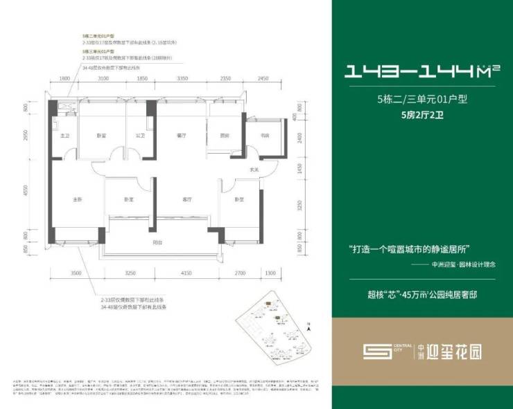 144㎡的5房2厅2卫,设计的是竖厅南北通透格局,独门独户,客厅4.15米开间,LDKB一体化设计,四开间朝南,客厅连接次卧出7.4米长的大阳台,U型厨房,卫生间干湿分离,得房率约:75%(不含赠送),阳台主朝正南向。