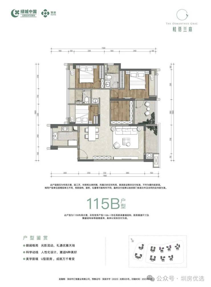 光明中心区,绿城桂语兰庭1期于2023年3月8日首推入市,本次推出3栋A/B/C/D/E座,面积有89㎡的3房2厅2卫,115-128㎡的4房2厅2卫户型,共942套房源,备案均价5万/㎡,备案单价4.07-5.93万/㎡,总价363-738万/套,当时开盘是备案价销售,现房带精装交房。