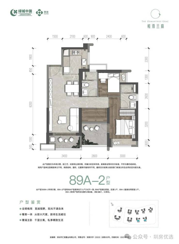 89㎡的3房2厅2卫(一期A-2户型),3栋B/C座01.02户型,设计的是经典竖厅格局,得房率:75.2%(不含赠送),客厅约5㎡西南朝向。套内面积66.85㎡+赠送面积8.54㎡=实用面积75.39㎡,加上赠送后得房率约84.78%。