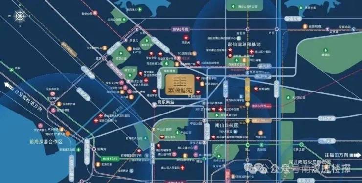 项目周边聚集深圳头部产业资源:西侧为科技园(腾讯、大疆等科技企业总部),东接前海金融中心,南靠蛇口自贸区,北邻留仙洞战略性新兴产业总部基地。区域内以高新技术、金融、总部经济为主导,吸引大量科技从业者及金融精英,形成高净值人群聚集效应。同乐片区未来或承接南山产业外溢,成为职住平衡的重要节点。