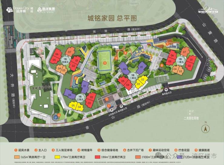 •小区配套:文化活动中心、古井下沉广场、约1200㎡社区活动场地、三人制足球场、儿童游乐园、健康跑道、疗愈花园、四大架空层花园