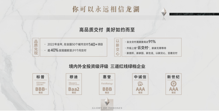 强交付力:全国项目100%如期交付,其中超40% 提前至少1个月交付,业主交付满意度91%;
