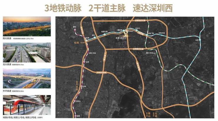 2大主干道:光明经济发展轴松白路在侧,贯穿全区;约1km瞬达南光高速入口,直达南山;