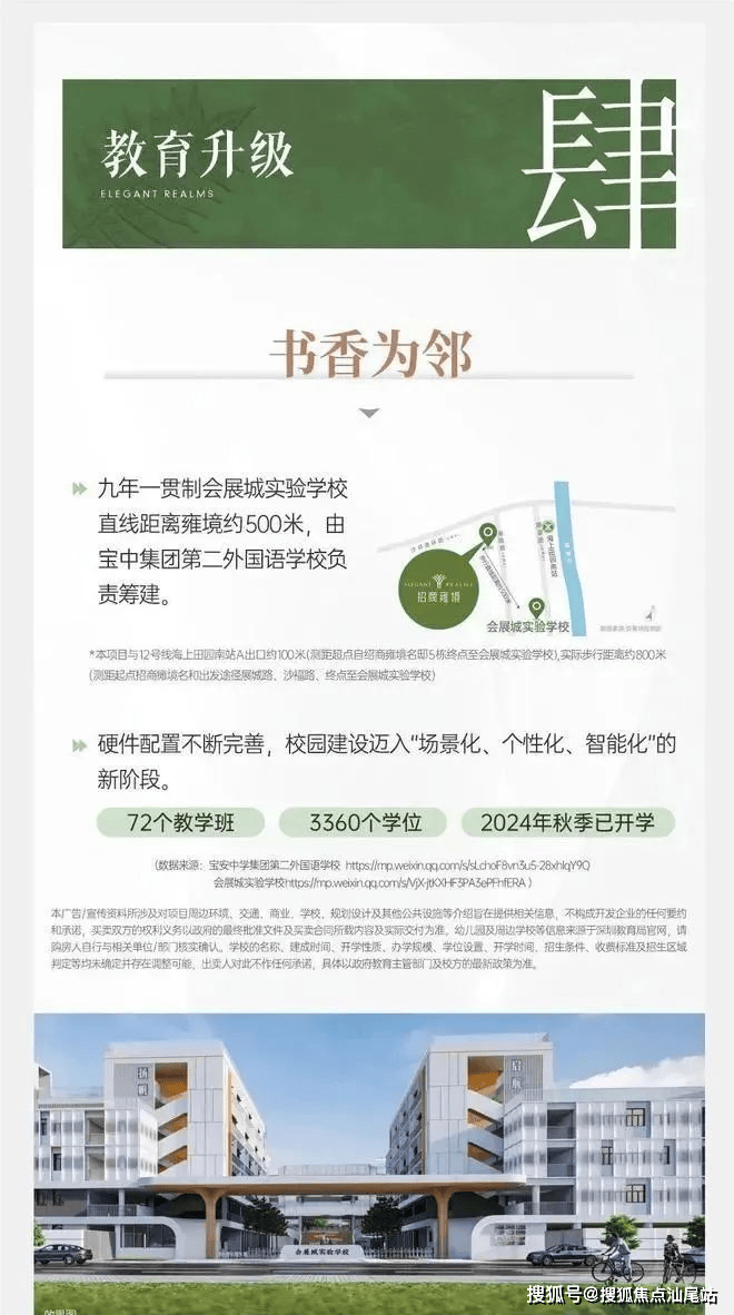项目自带有1所9班制幼儿园,南侧约400米有会展湾实验学校,九年一贯制,72个班,3360个学位,由宝安中学(集团)第二外国语学校打造,去年9月份首次招生(小一录取积分96.8分,初一录取积分89.2分)。