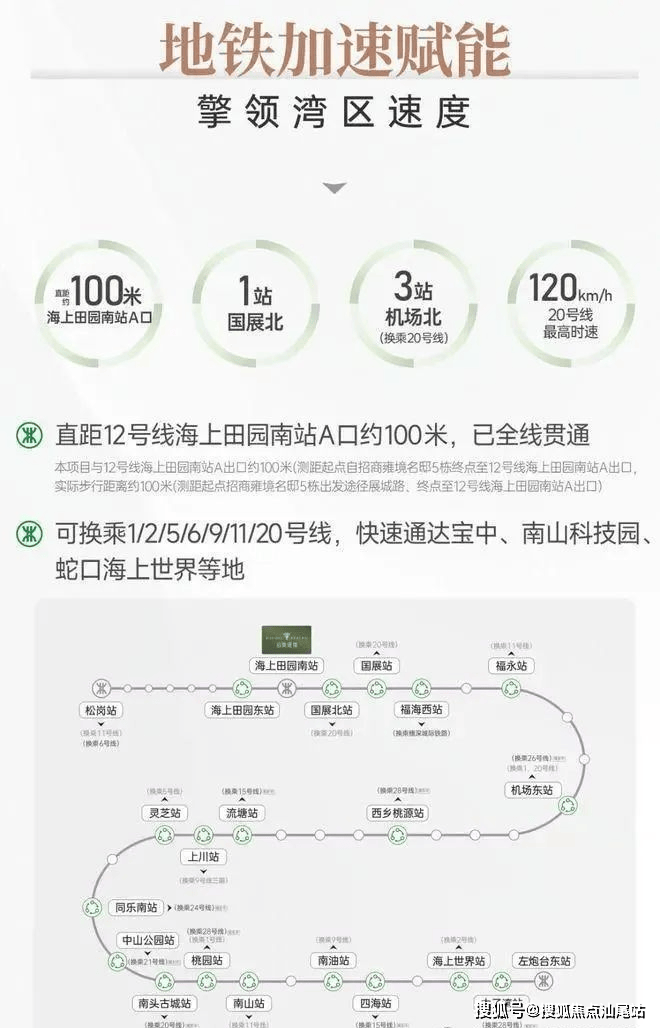 项目出门就是12号地铁线“海上田园南站”,步行约500米国展北站(12/20号线),5站到福永可换乘11号地铁线。可换乘1/2/5/9/11/20号线等多条线路,