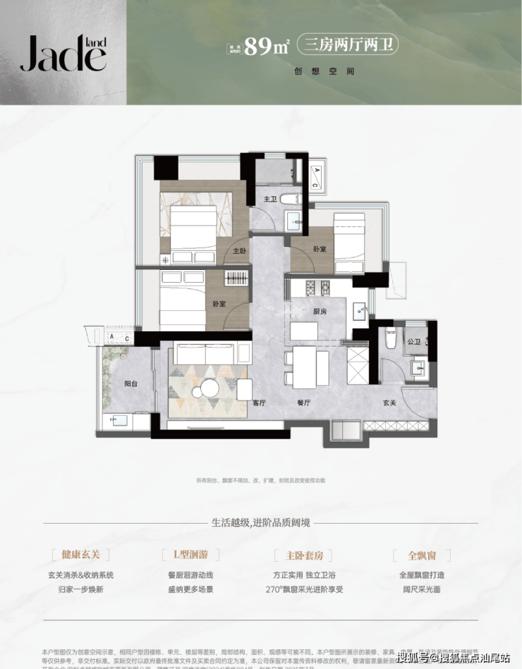 89㎡三房两卫(总价约400万):三开间朝南,主卧与次卧配备270°飘窗,采光优越,L型洄游厅提升空间感,兼顾实用性与舒适度。