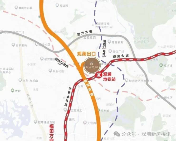 项目毗邻地铁4号线观澜站(步行约10分钟),未来可换乘在建的22号线,形成双轨出行网络。通过4号线10站可达深圳北站,16站直达福田CBD。周边路网发达,紧邻梅观高速、龙华大道等主干道,快速联通深圳全域。但当前公共交通依赖地铁及公交接驳,部分公交线路覆盖不足,且地铁站距离约1公里,对无车族稍显不便。规划中的慢行系统将串联观澜河沿线公园,提升步行便利性。