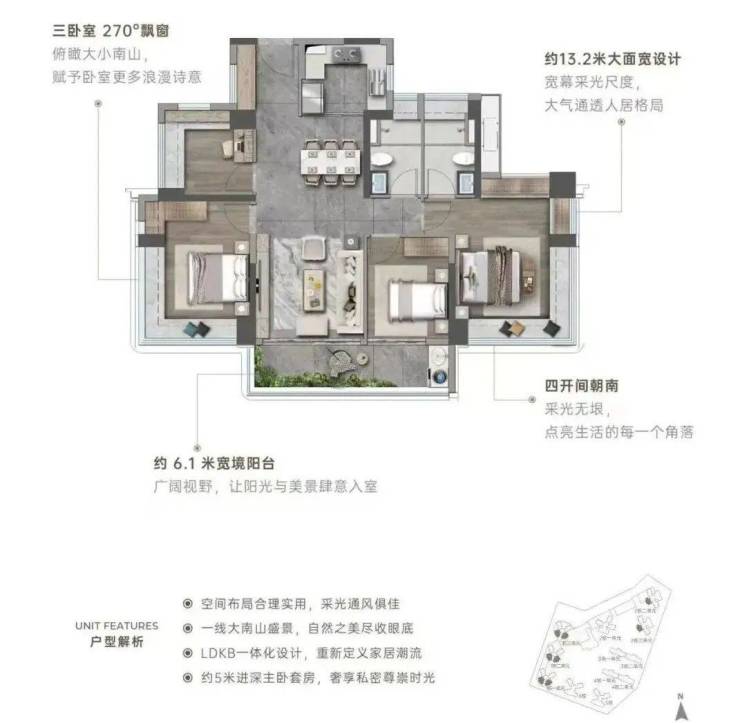 ⑥【一步到位性价比王牌 前海改善头等舱】4栋建面约138㎡奢阔山居范本:LDKB一体化,增配多功能厅、最大约15.5米南向四开间、约6m宽境阳台、主卧270°巨幕飘窗带独立卫浴及衣帽间、最高约94%拓展后综合使用率