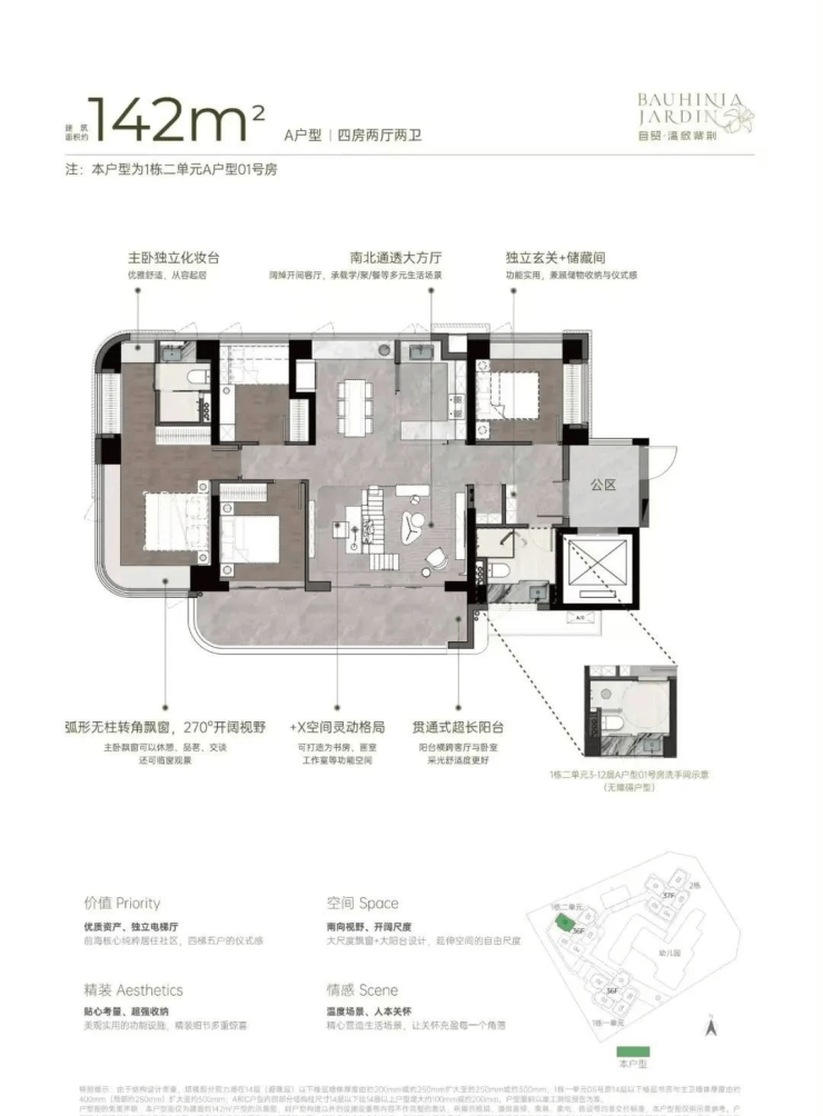 双龙抱珠户型,整个户型非常通透。书房分布于客厅另一侧,难得的双面采光+270°景观视野。主卧南北通透,景观面开阔。