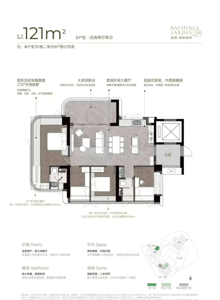 四房为主,多种厅式可选;大面积的飘窗利用,采光面大、实用率高;转角处使用弧形玻璃且都是无柱设计,景观视野佳;