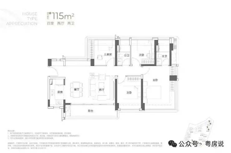 115㎡的4房2厅2卫:横厅南北通透格局,客餐厅6米开间,LDKB一体化,全屋飘窗,4个卧室分别做到了3.9米/3米/2.8米/2.6米的宽度,主卧加1个次卧270°全景飘窗,客厅出6米长的大阳台,L型厨房,得房率约95-97%(包含赠送),西南或东南朝向。115平米户型分布在1栋1单元、1栋2单元、1栋3单元01/02户型,01户型西南朝向都是看小区外围,02户型看向小区;