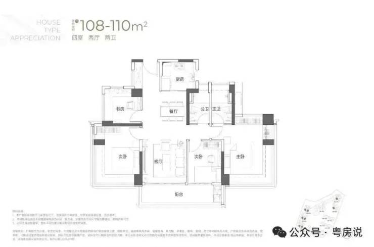 108-110㎡的4房2厅2卫:竖厅双龙抱珠格局,客厅开间3.5米,LDKB一体化,4个卧室分别做到了3.7米/3.4米/2.8米/2.6米的宽度,主卧加2个次卧270°全景飘窗,客厅连接次卧出6.1米长的大阳台,U型厨房,得房率约95-97%(包含赠送),西南或东南朝向。户型分布在1栋1/2/3单元03/04户型,03户型东南朝向,04户型西南朝向;只有2栋2/3单元看小区,其他都看向小区外部;