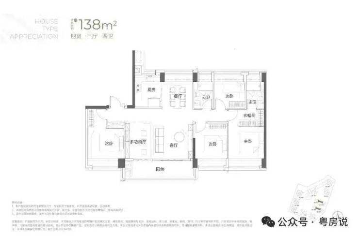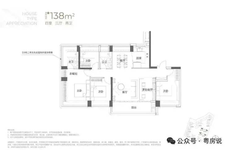 138㎡的4房2厅2卫:竖厅南北通透格局,专梯入户,客厅6.1米开间,LDKB一体化,全屋飘窗,4个卧室分别做到了3.9米/3.25米/2.9米/2.8米的宽度,主卧加1个次卧270°全景飘窗,客厅出6.1米长的大阳台,U型厨房,得房率约95-97%(包含赠送),阳台主朝西南向。138平米户型分布在3栋1单元、3栋2单元、4栋1单元、4栋2单,4个单元纯大户型。